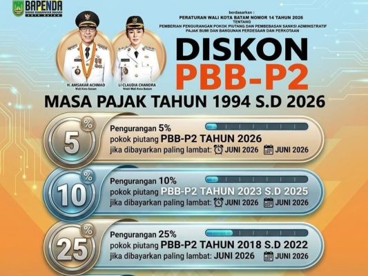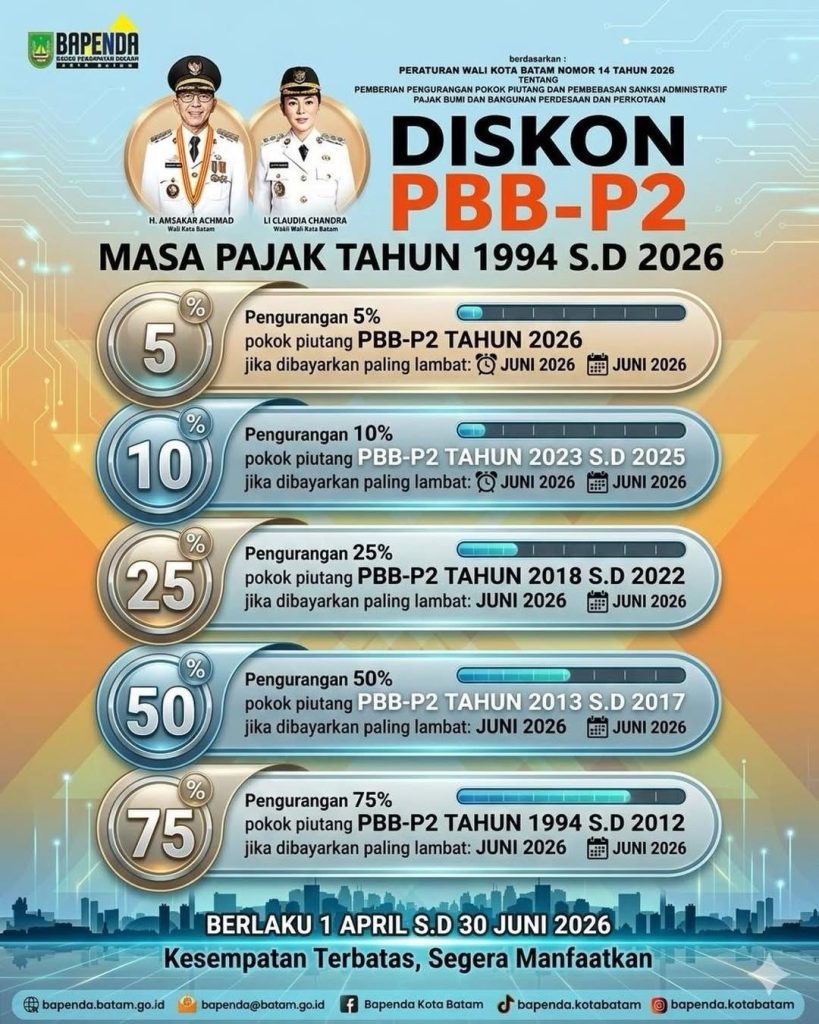 Batamline.com, Batam – Pemerintah Batam memberikan keringanan pajak bagi masyarakat melalui program diskon Pajak Bumi dan Bangunan Perdesaan dan Perkotaan (PBB-P2) yang mulai berlaku pada 1 April hingga 30 Juni 2026. Program ini mencakup pengurangan pokok piutang pajak untuk periode panjang, yakni dari tahun 1994 hingga 2026.